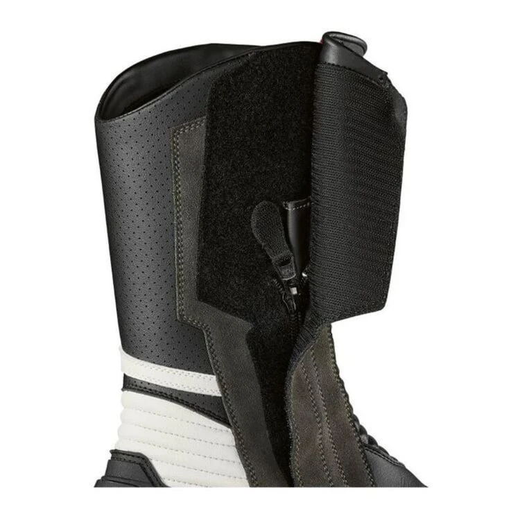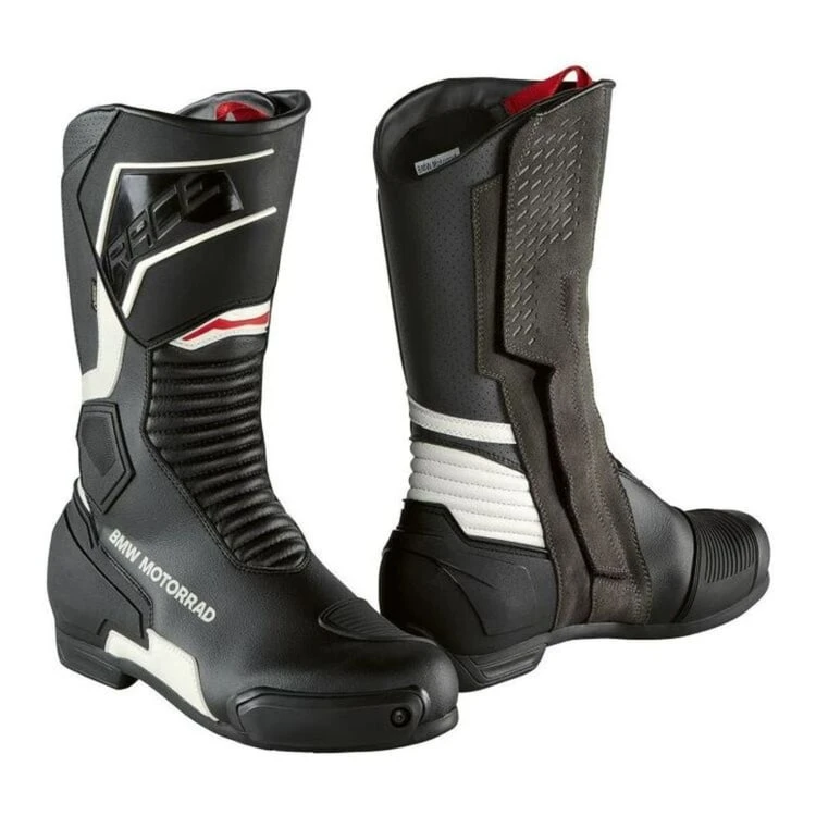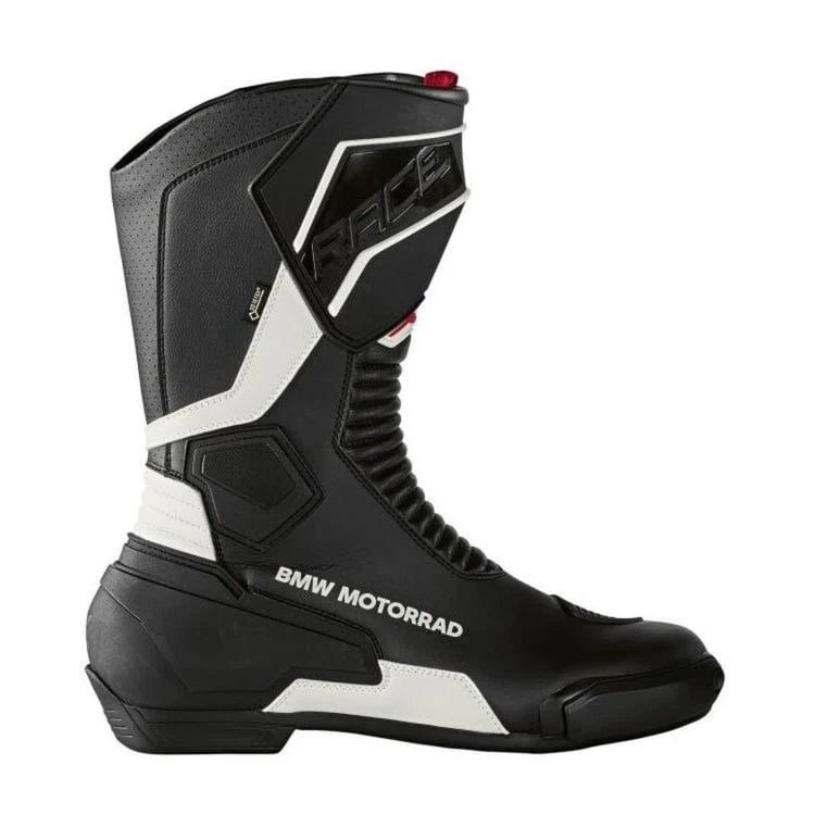 The wind- and waterproof Pro Race GORE-TEX boots have a modern look and several safety features. Removable slip pads at the tip of the shoe. A large 3D heel guard and a shin guard prevent injuries and ensure long life. A large BMW Motorrad inscription rounds off the look.