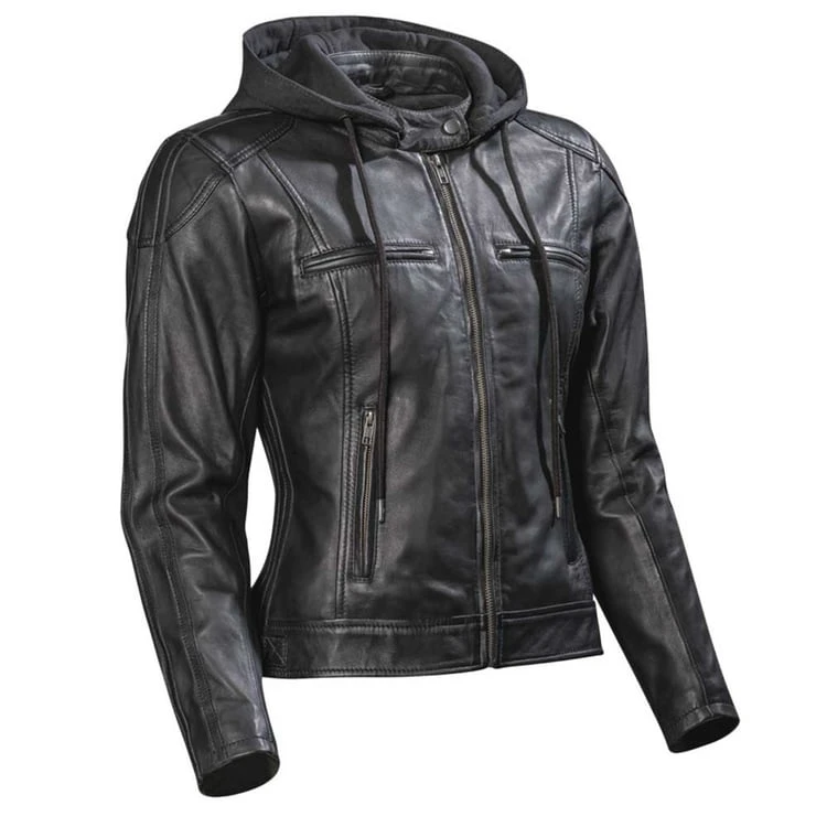 Stylish retro motorcycle jacket for women made of high-quality, super supple sheep leather. Further important details include the detachable hood, certified protectors, thinly lined and a practical connection zipper.