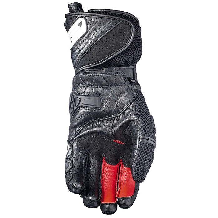 This sport and road-oriented, ultra-ventilated style, follows the characteristics of the RFX2 but incorporates special materials (perforated leather, ventilated mesh fabric) and the vented PU upper shells from the RFX1, to offer optimum air circulation. Mixed palm in full-grain leather and perforated leather, with synthetic leather reinforcements to increase grip and PU slider. Perforated leather cuff with 3D semi-rigid TPR FIVE logo. Thumb and upper sections in mesh fabrics enhance airflow. Gel thumb reinforcements. The RFX 2 Airflow offers top-level protection, excellent fit, and, especially, effective ventilation that makes it the perfect glove for summer riding.