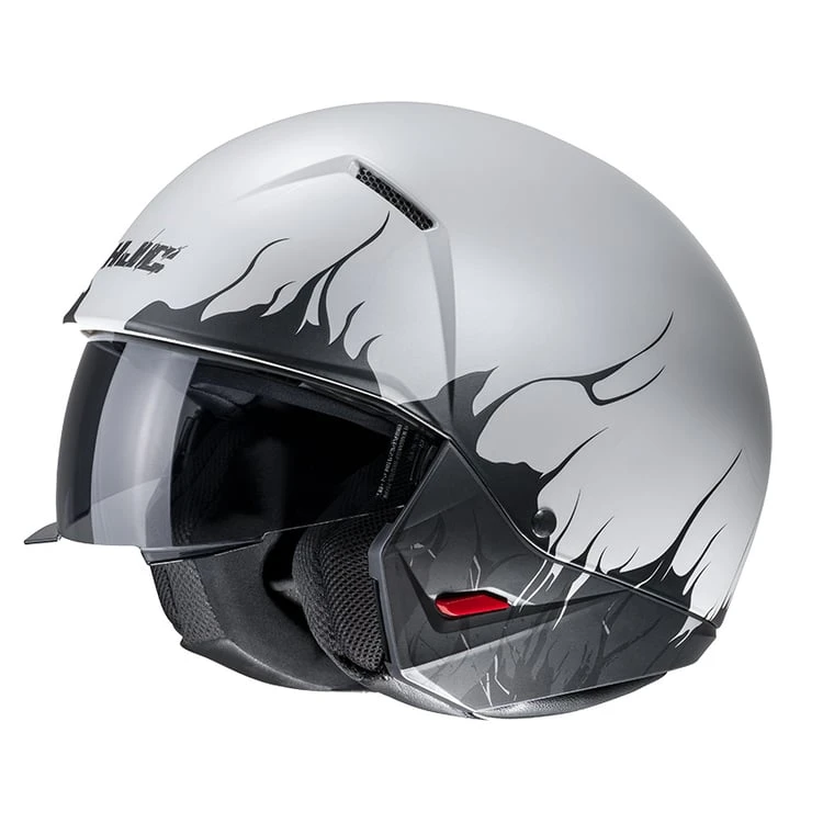The all-new HJC I20 is designed to give riders a different approach to the classic open-face/half helmet. This street fighter-inspired helmet comes with a removable mask and WIDE-VISION ANTI-FOG COATED SUN VISORS (SMOKE & CLEAR) that manually operates with pull tabs located on each side of the helmet.