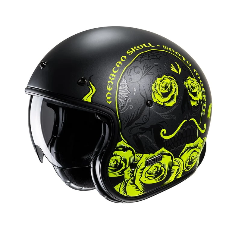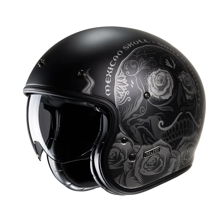 The V31 is a retro-style open-face helmet composed of an advanced fibreglass composite shell to provide a lightweight helmet. This Âľ helmet features an integrated 3-position sun shield with an anti-scratch coating that deploys easily to slide up or down. To enhance the vintage feeling the V30 is fitted with a leather and suede interior and a goggle strap holder. The ear padding is removable and washable and speaker pockets are prepared for Bluetooth communication.