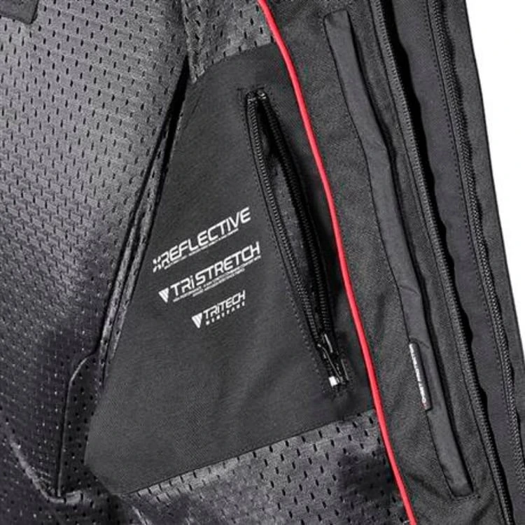 Refined racing styling with comfort and functionality from a jacket constructed in TriTech performance fabric combined with TriStretch Aramid stretch fabric inserts and breathable waterproof TriTech membrane lining. Jacket incorporates removable D3O shoulder, elbow and back protectors and new TPU-moulded shoulder panels.